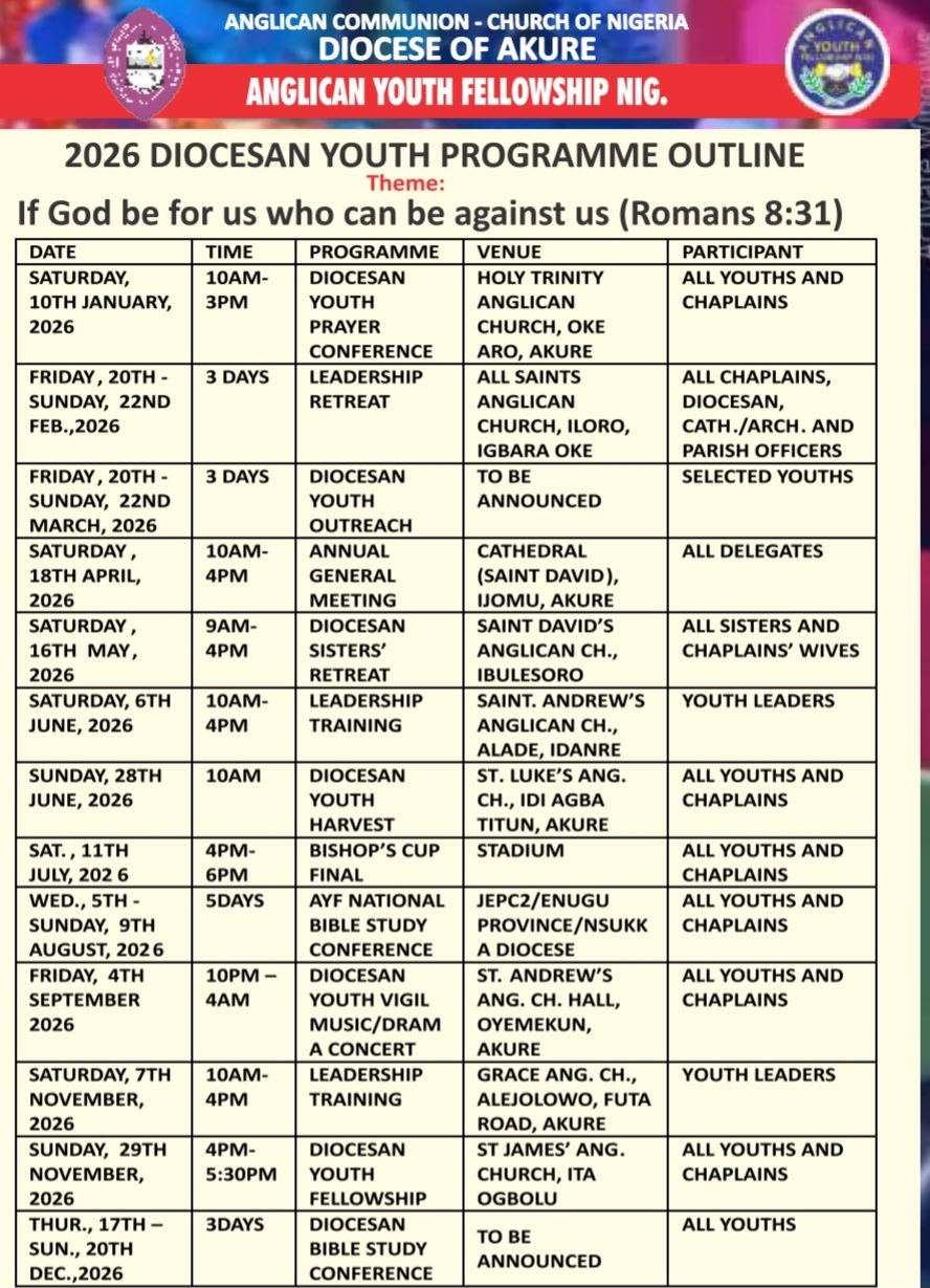 What became the Anglican Youth Fellowship Akure Diocese is the offspring of the Akure Diocesan Youth Fellowship. The Pioneer President of the Akure Diocesan Youth Fellowship was Bro. Henry Olugbenga Bankole Ajayi (now Venerable and current Director, Youth Board Akure Anglican Diocese) and the Youth Chaplain then was the now retired Venerable Francis Oludare Orogun and this can only imply that there was two people heading the affairs of what seems like the Youth Body of the Diocese when the Diocese was created.